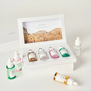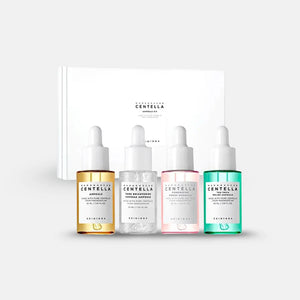 Pamper your skin with this Madagascar Centella Ampoule Kit containing four mini-sized ampoules targeting different skin concerns. The Centella Ampoule soothes and repairs damaged skin. The Tone Brightening Capsule Ampoule evens skin tone for a radiant finish. The Poremizing Fresh Ampoule minimizes enlarged pore. The Tea-Trica Relief Ampoule calms irritation and treats acne. Take a few drops of the ampoule and gently apply on face.